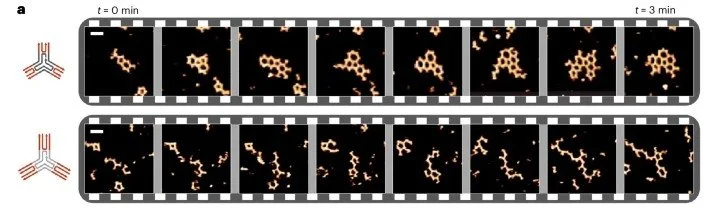 Time-lapse of short (top) and long (bottom) 3PS self-assembly over 3 min, highlighting the difference in nucleation. Snapshots are taken from full-length time series. Taken from https://www.nature.com/articles/s41557-025-01741-y